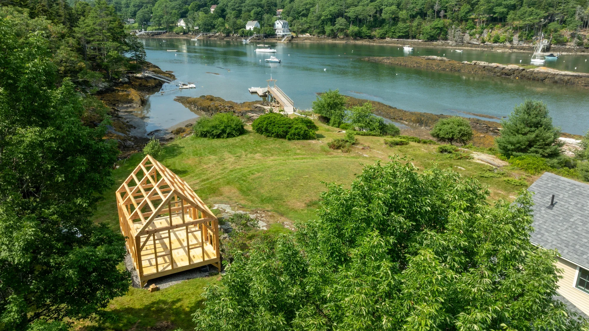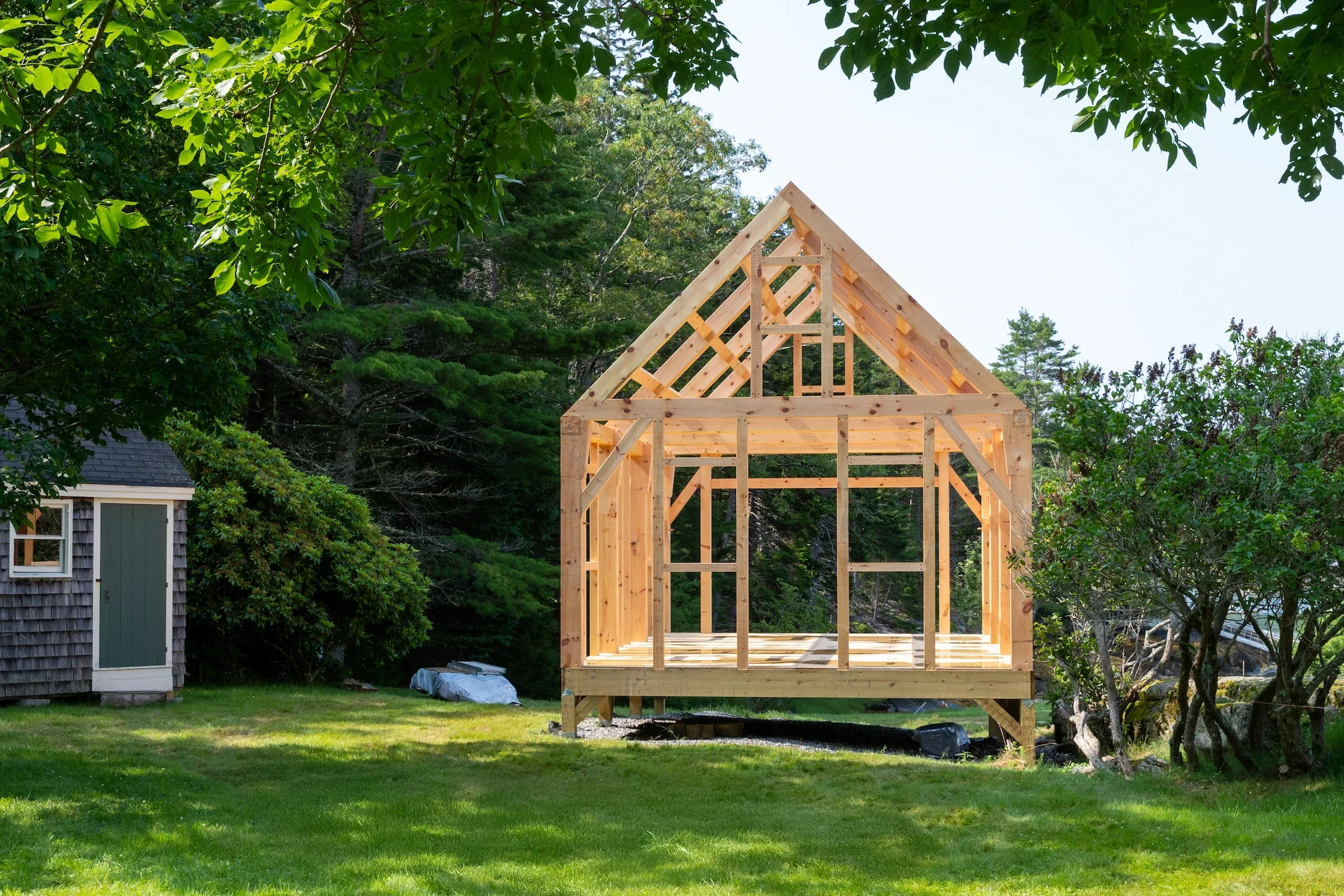 Created for hosting backyard wine-tasting and cove gazing, the Five Islands Cottage reflects the beauty of its natural surroundings. The 16' x 25' frame is a rebuild of an 1800s boathouse which was destroyed in coastal flooding. The upgraded frame was relocated onto higher ground, nestled into the ledges of the rocky Midcoast landscape.